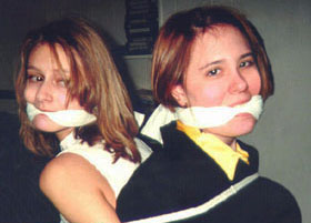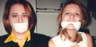 This is one HOT video from our very first shoot with 'good girls' Sasia & Kristy (no nudity in their videos). This one's for fans who love lots of GAG TALK, chloroform and on-screen gagging with their bondage! Sweet, petite, blonde Sasia Cantrel is a college co-ed who teams up with her girlfriend, buxom brunette Kristy Farell in this 'knock-out' debut! The girls decide to pick on the school geek, and revel in teasing him with their charms. They laugh at him and insult him until he finally takes action! He chloroforms each girl seperately in dramatic and vocal struggling scenes and carries their limp bodies around (both girls are carried over the shoulder AND in his arms, seperately). What follows is an exhaustive display of binding gagging and chloroforming, as the girls are bound to chairs, on the floor, back-to-back, etc. There are some great shots of their unconscious bodies laying next to each other, helpless and vulnerable to the geek, who mercilessly binds and torments them with his plans for taking care of their 'big mouths'! In one scene, the girls argue over who should get gagged first, with Kristy losing out to a roll of white plastic tape. Sasia laughs at her and mocks her, commenting on how cute she looks with a gagged mouth, until she is cloth gagged as well!
