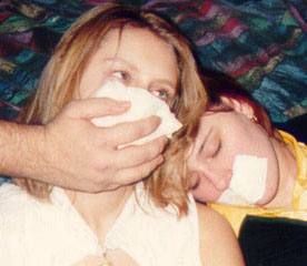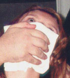 Sasia attempts to escape, but as she reaches the door a familiar, cruel hand is clamped over her protesting mouth and she's forced back into the room with Kristy who "MMMPHs" and moans at the geek as Sasia is chloroformed right in front of her (this girl is great at rolling her eyes while passing out), and left lying unconscious on the floor next to her. Kristy moans and tries to wake her up, but the geek eventually returns and chloroforms her as well, in yet another great close-up! There is one scene in which the girls are sitting together unconscious; Kristy's tape-gagged head rests on Sasia's shoulder. Sasia wakes up, only to be immediatly drugged again, with her eyes rolling beautifully for the camera as she goes back to sleep. Kristy is also given a little extra chloroforming to keep her quiet and drugged during this scene too, while still in bondage.